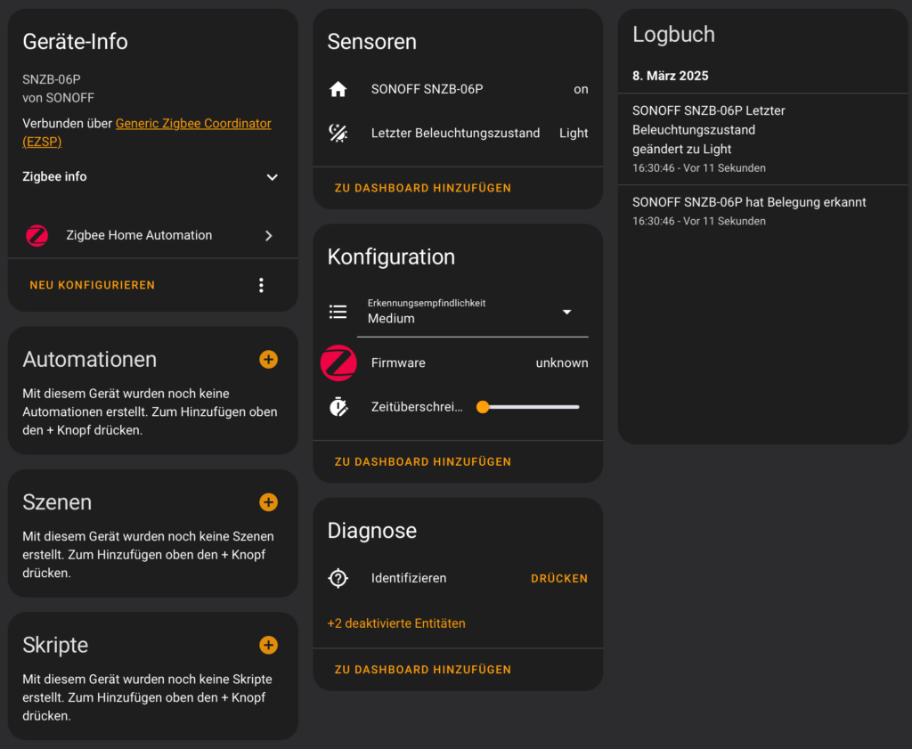 Die Installation ist unter ZHA relativ schnell erledigt. Ihr fügt einfach ein neues Gerät in ZHA hinzu und verbindet den Sensor mit Strom. Daraufhin sollte er automatisch erkannt und angemeldet werden. Wählt einen Bereich und ihr seid fertig. Die aktuelle Firmware hat die Version 1.0.6 (Stand März 2025).