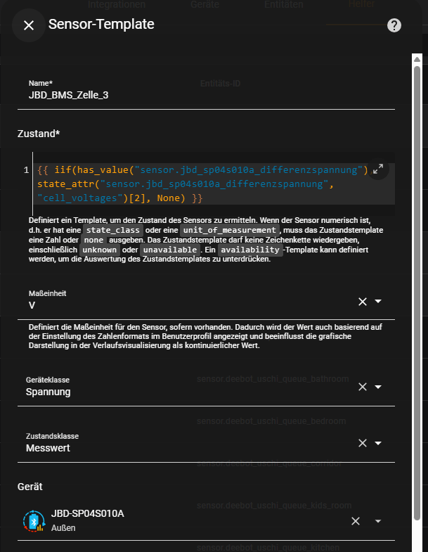 Bei dem Template müsst ihr natürlich den Namen des Sensors anpassen. Der Index geht von [0] bisj [Zellen -1], also von [0] bis [3] bei einer vier Zellen Batterie. Ihr müsst also pro Zelle einen Sensor erzeugen, habt dafür aber alle Zellen überwacht.