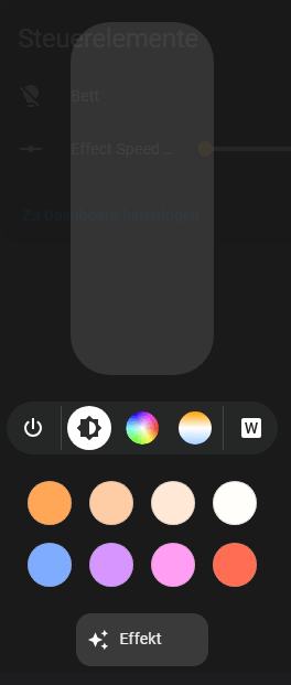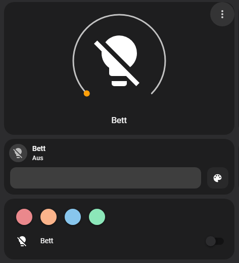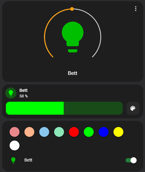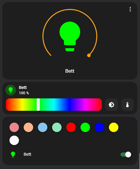 Ich bin kein Fan der Home Assistant Light Card, da sie für die Touchbedienung nicht optimal ist. Ich greife lieber zu Karte wie Mushroom Cards oder der RGB Light Card. Anhand der Bilder könnt ihr euch selber einen Eindruck verschaffen. Die Mushroom Cards bieten eine gute Steuerung und die RGB Light Card kann sehr gut vor konfiguriert werden. Es sollte also für jeden Geschmack etwas dabei sein.