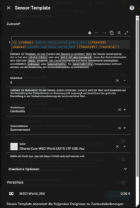 1;SQLDa wir jetzt den Aktuellen Wert und den Wert vor 30 Tagen haben, können wir einfach die Differenz bilden und wissen somit wie sich der Kurswert innerhalb von 30 Tagen verändert hat. Dazu benötigen wir wieder einen Helfer, dieses mal vom Typ Template. Wechselt nun zu Einstellungen -> Geräte & Dienste -> Helfer -> Helfer erstellen. Wählt den Typ Template aus und anschließend Sensor. Vergebt einen sinnigen Namen und nutzt das unten aufgeführte Template und passt die Entitäten an. Dabei wollt ihr LTS-Sensor minus SQL-Sensor haben. Ich habe als Maßeinheit €, Geräteklasse Geldsaldo und Zustandsklasse Summenwert angegeben. Damit habt ihr nun die Wertentwicklung innerhalb von 30 Tagen.