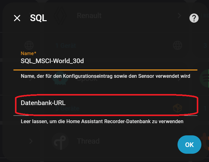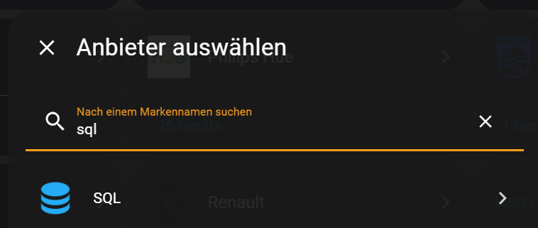 Nun müsst ihr 30 Tage warten, damit ihr auch Werte habt, natürlich geht auch weniger, dazu müsst ihr aber die spätere SQL-Abfrage anpassen. Ich hatte erst einen Versuch mit einem Statistik-Helfer gemacht, aber dieser versagte auch nach mehr als 10 Tagen. So musste ich eine neue Option suchen und bin bei der SQL Integration gelandet. Die Integration ermöglicht es SQL-Abfragen auf die Home Assistant Datenbank zu machen, mit all den Vor- und Nachteilen. Um nun einen SQL-Sensor zu erzeugen, wechseln wir zu Einstellungen -> Geräte & Dienste -> Integration hinzufügen -> SQL. Vergebt einen passenden Namen und wählt keine Datenbank aus. Somit wird auf die interne Datenbank zugegriffen.