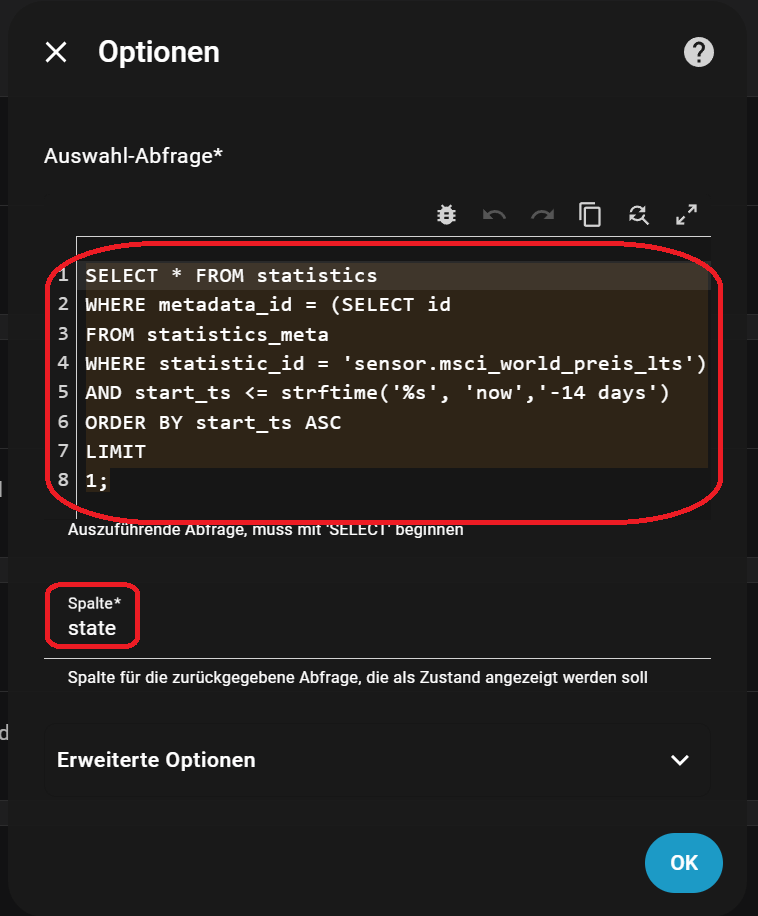 Verwendet die unterhalb eingefügt Abfrage und passt dort den statistics_id auf den zuvor erstellten LTS Sensor an. Die zu verwendende Spalte ist state. In der erweiterten Optionen habe ich als Maßeinheit €, Geräteklasse Geldsaldo und Zustandsklasse Summenwert angegeben. Die Abfrage wird den ersten verfügbaren Wert innerhalb von 30 Tagen liefern, also auch wenn ihr nur Werte für ein paar Tage habt.